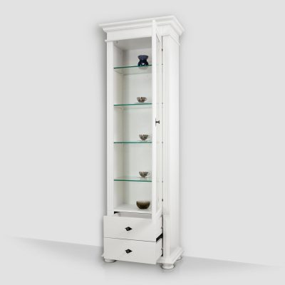Vitrina poate fi gazda ideala pentru vesela, tacamuri sau alte obiecte de pret. De o nuanta alb antic si realizata din lemn masiv, aceasta are si un important rol decorativ datorita aspectului sau inedit.